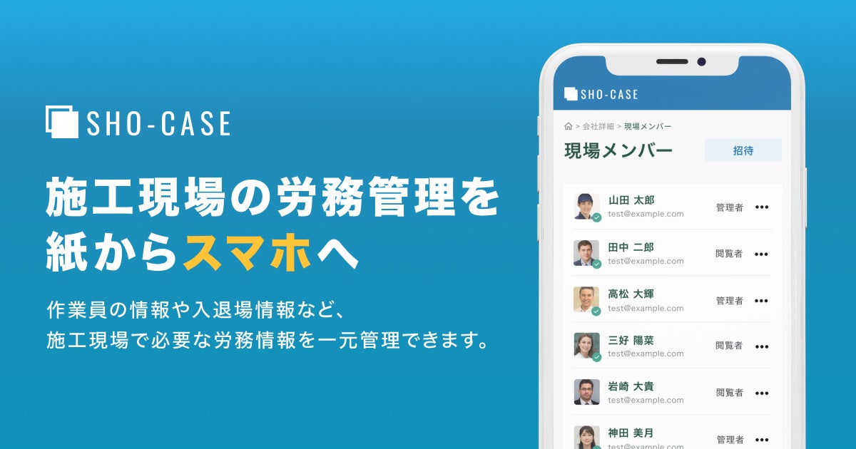 「SHO-CASE」とは、元現場監督が開発した、施工現場の労務安全管理に関する課題をテクノロジーのチカラを使って解決するために立ち上げたクラウドサービスです。URL:https://sho-case.jp/