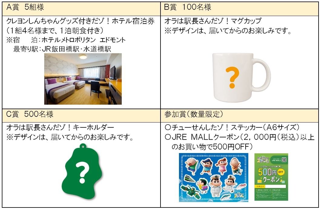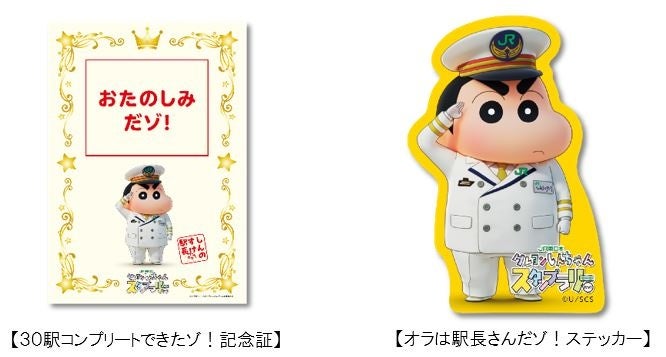 〇30駅コンプリート用スタンプ帳に全てのスタンプを集めると、数量限定で特別な記念証とステッカーをプレゼントします。また、全てのスタンプを集め、アンケートにお答えいただいたお客さまへWチャンスとして、「クレヨンしんちゃんグッズ付き ホテル宿泊券」等の素敵な賞品が当たる「お楽しみだゾ!チューせんかい」を実施します。