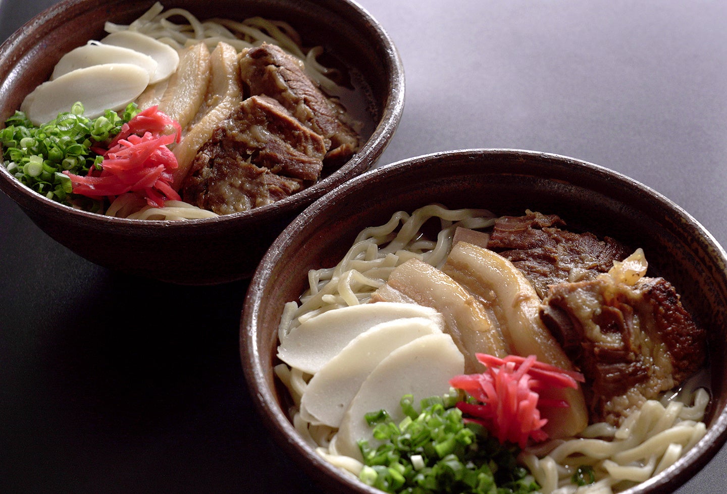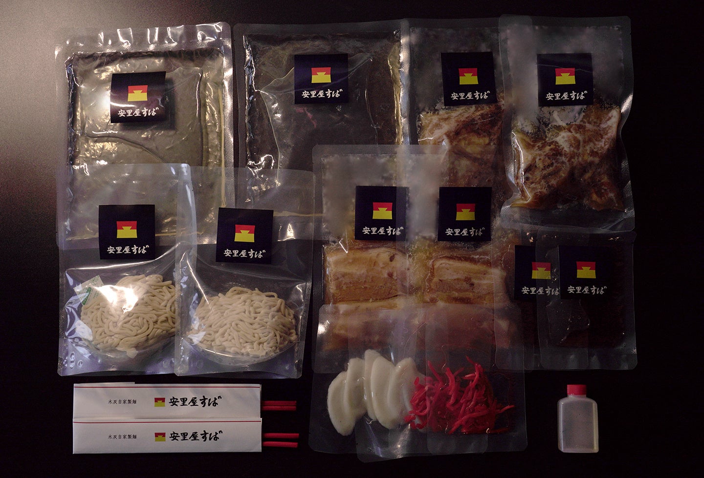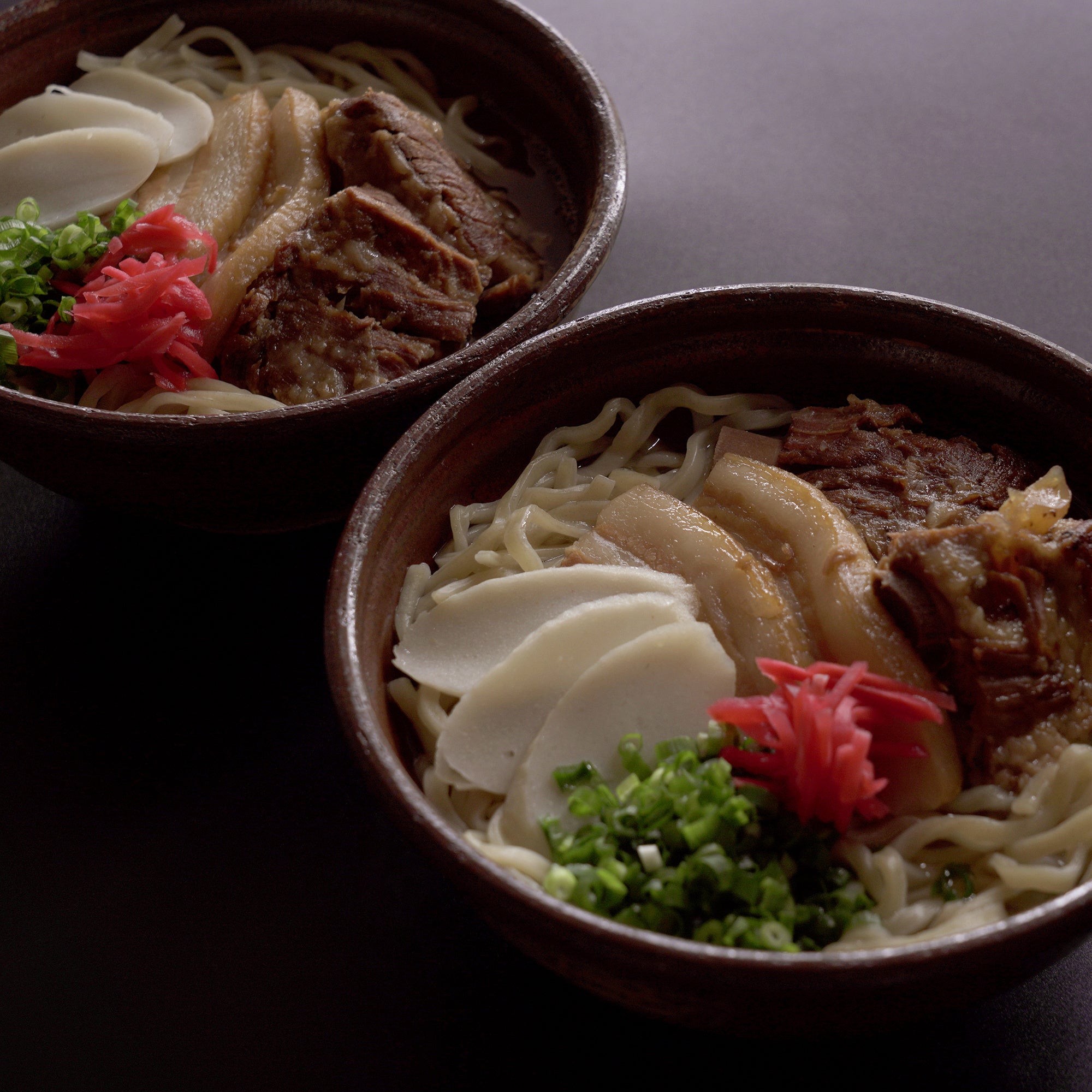 全国初となる保存料を一切使用しない希少な木灰(もくはい)自家製生麺と真昆布・鰹・豚骨の無化調ブレンド出汁、上質な具材を贅沢にセット化した「献上 沖縄すば」。