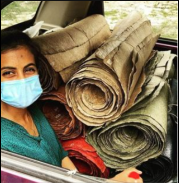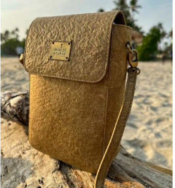 ↑中央:共創パートナーであるマライ社代表ザズアナ氏 ↑ココナッツレザー製バッグ