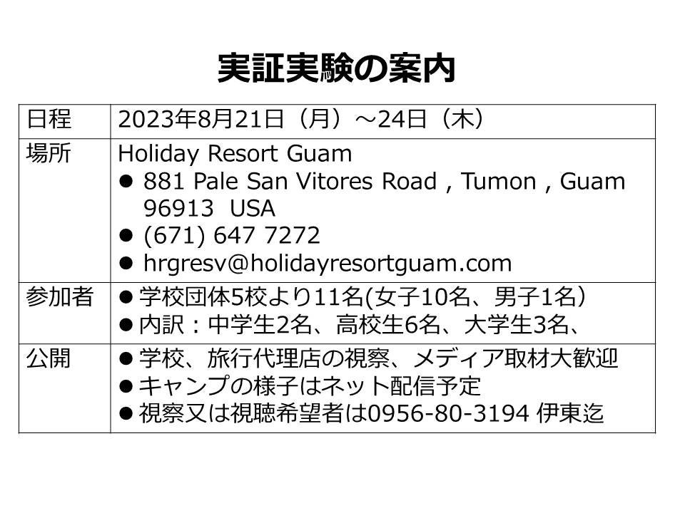 プログラムの詳細に渡る検証のため、8月に以下の通り公開実証実験を実施します。学校、旅行代理店の視察、メディアの取材は大歓迎です。またこの様子を、リアルタイムでネット公開しますので、現地にお越しになれない方は是非ご視聴ください。