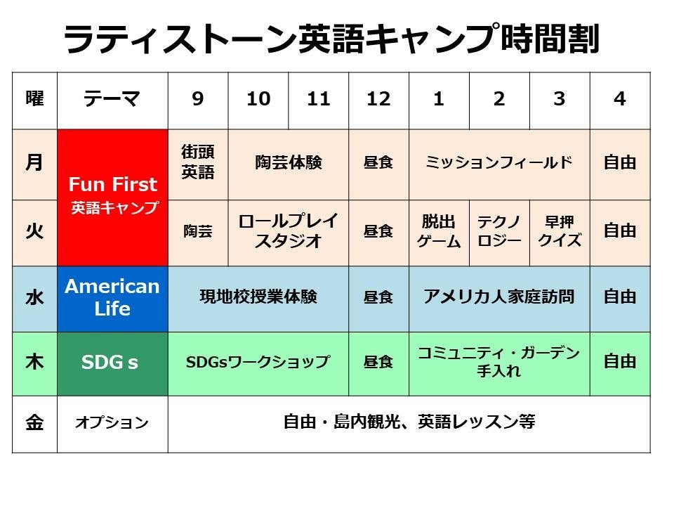 下表にLECの基本日程を示します。参加者は日曜日にグァムに到着した後、月曜日から木曜日までの4日間、英語漬けの日々を送ります。この四日間は、Fun First 英語キャンプ、 American Life体験、Green & Ecoの三つの部分から構成され、多面的に国際人を育成します。翌金曜日は参加者の自由行動になり、土曜日に帰国します。1回のキャンプでは20名前後の参加者を想定しています、