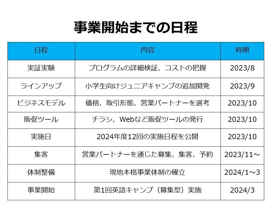 上記実証実験を通じ、各プログラムの効果や運用を検証し、中高、大学生対象のスチューデンツ・キャンプを完成させるとともに参加料金やビジネスモデルも決定します。またスチューデンツ・キャンプの派生品として小学生向けジュニア・キャンプの開発を行います。以降、下表に示す日程に沿って、来年3月のラテストーン英語キャンプの開始にむけ進んでまいります。