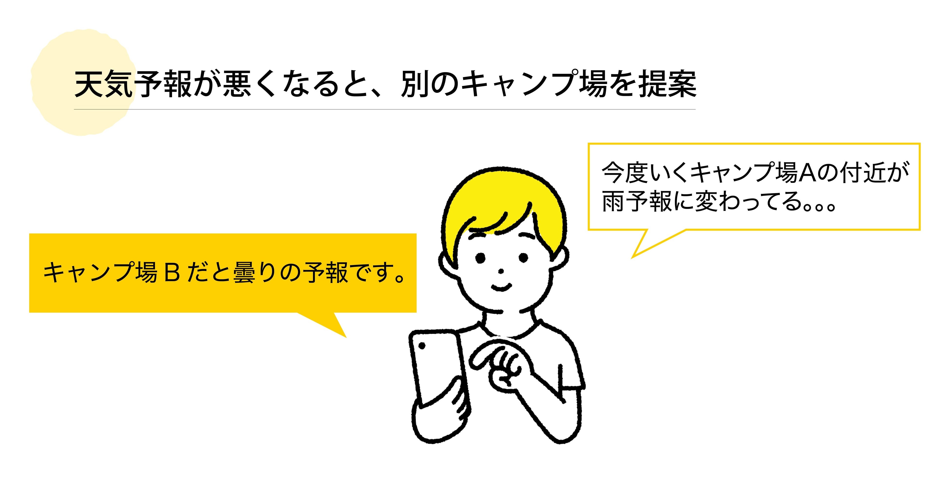 予約したキャンプ場の天気予報が悪化した際に、その近くの、天気が良くなる確率が高いキャンプ場を提案してくれる機能です。