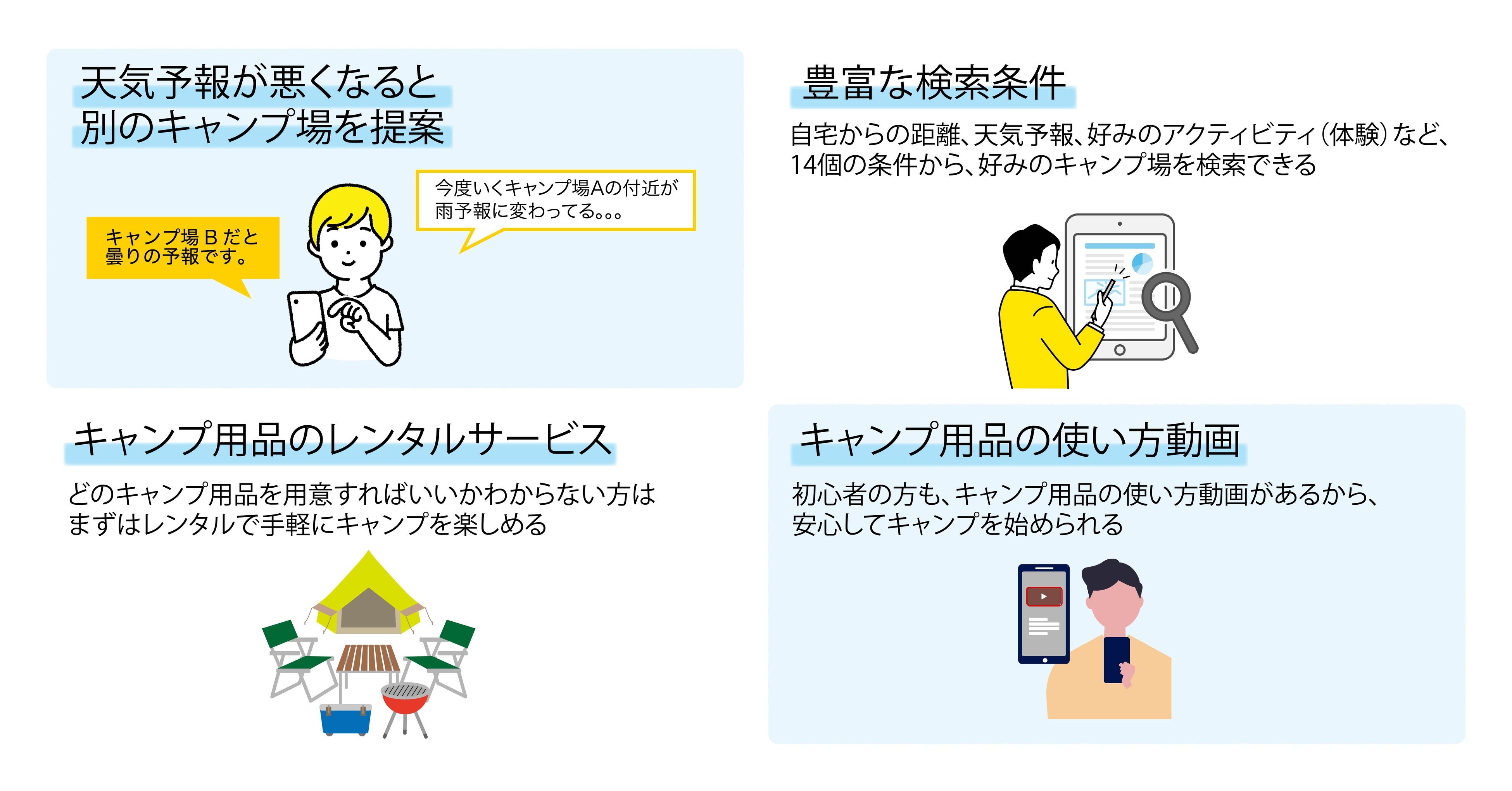「天気」「自宅からの距離」「駐車スペース有無」などの様々な条件で、キャンパーがベストなキャンプ場をスムーズに検索できる機能に加え、特許技術を用いた「天気予報が悪くなると、別のキャンプ場を提案してくれる機能」が搭載されています。