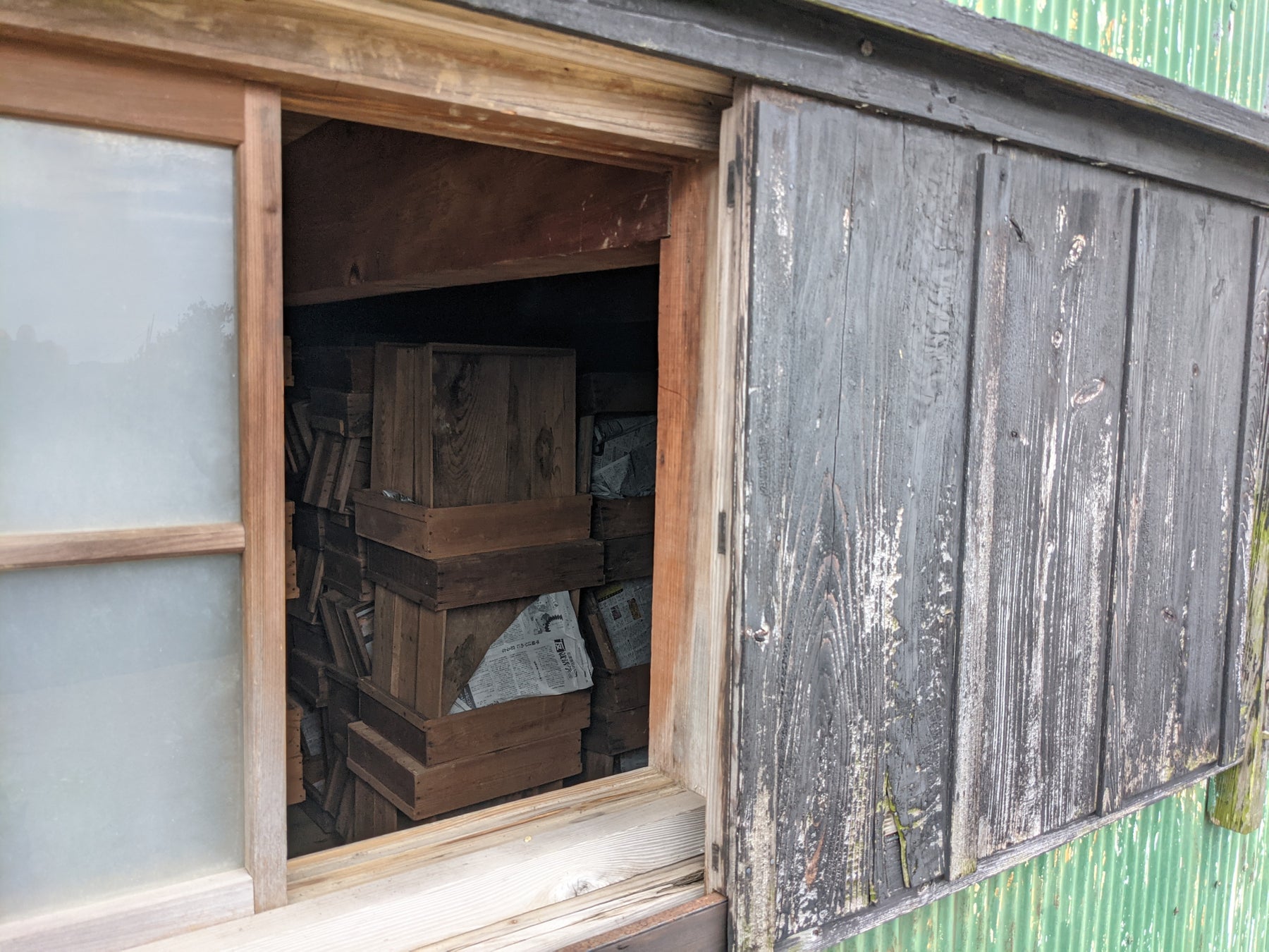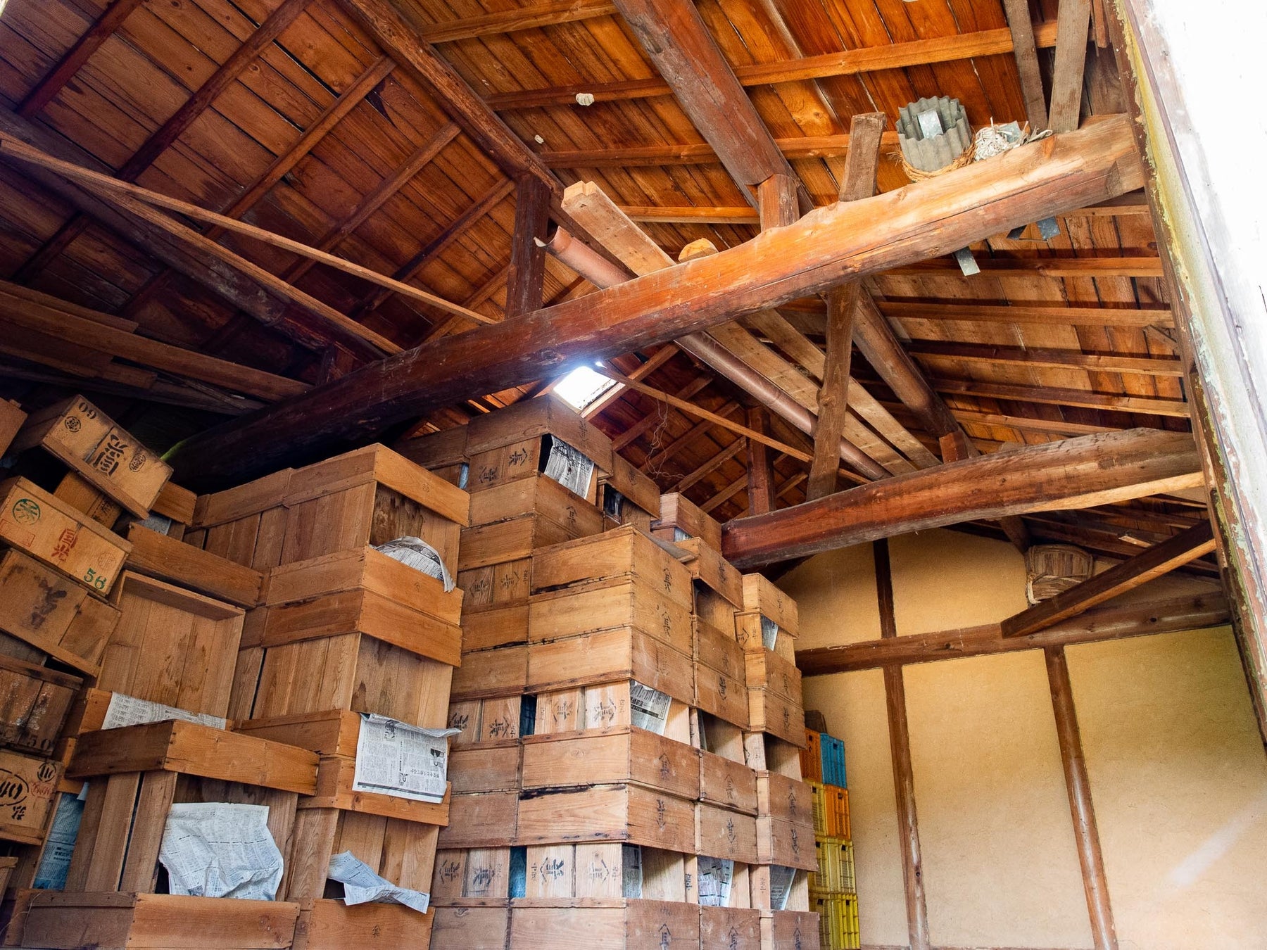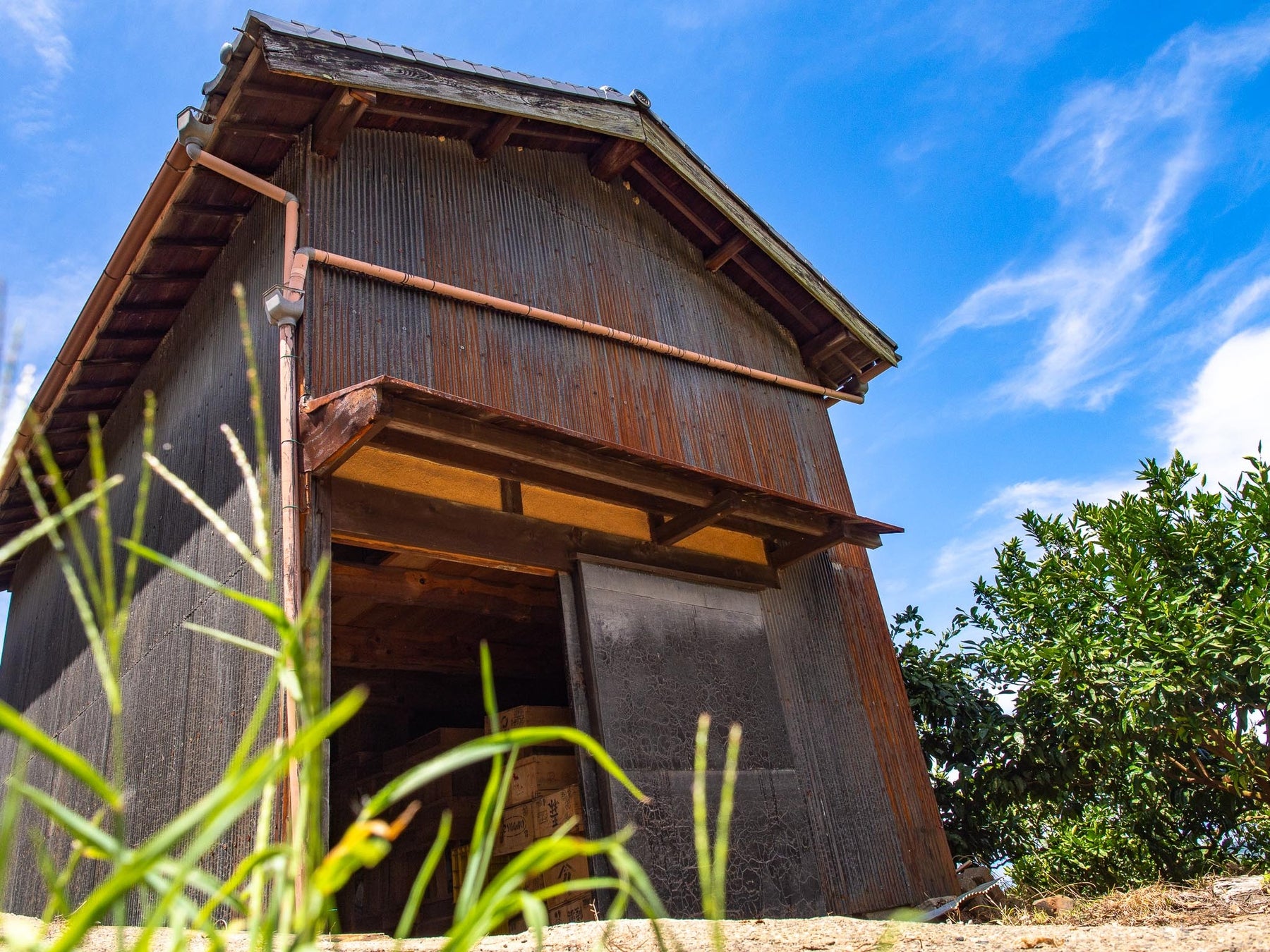 蔵出しみかんの貯蔵庫は木造建築。柱や梁、扉など、すべて木で作られています。