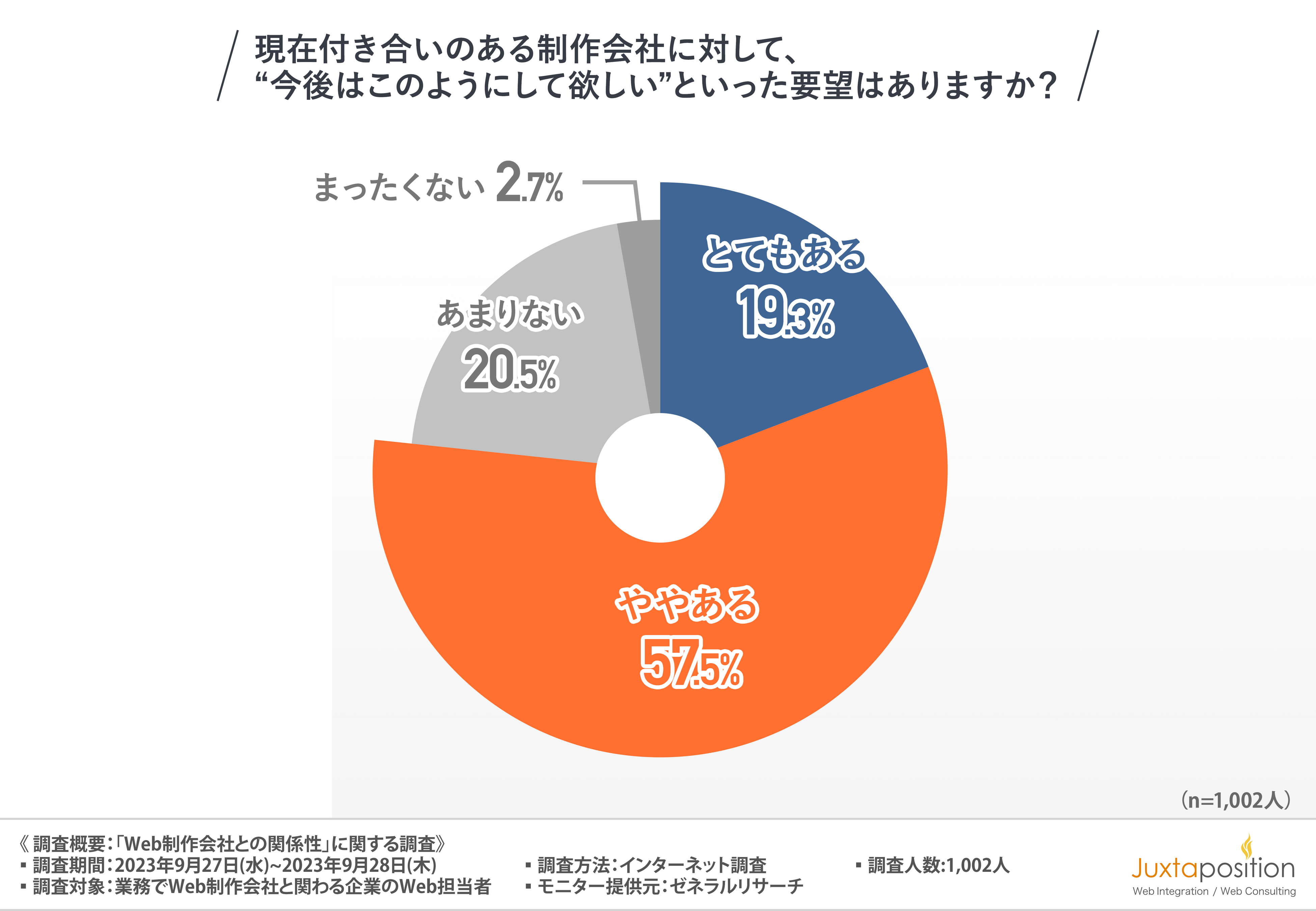 「現在付き合いのある制作会社に対して、“今後はこのようにして欲しい”といった要望はありますか?」と質問したところ、『ややある(57.5%)』と回答した方が最も多く、『とてもある(19.3%)』とあわせて、およそ8割の方が制作会社に要望があると回答しています。