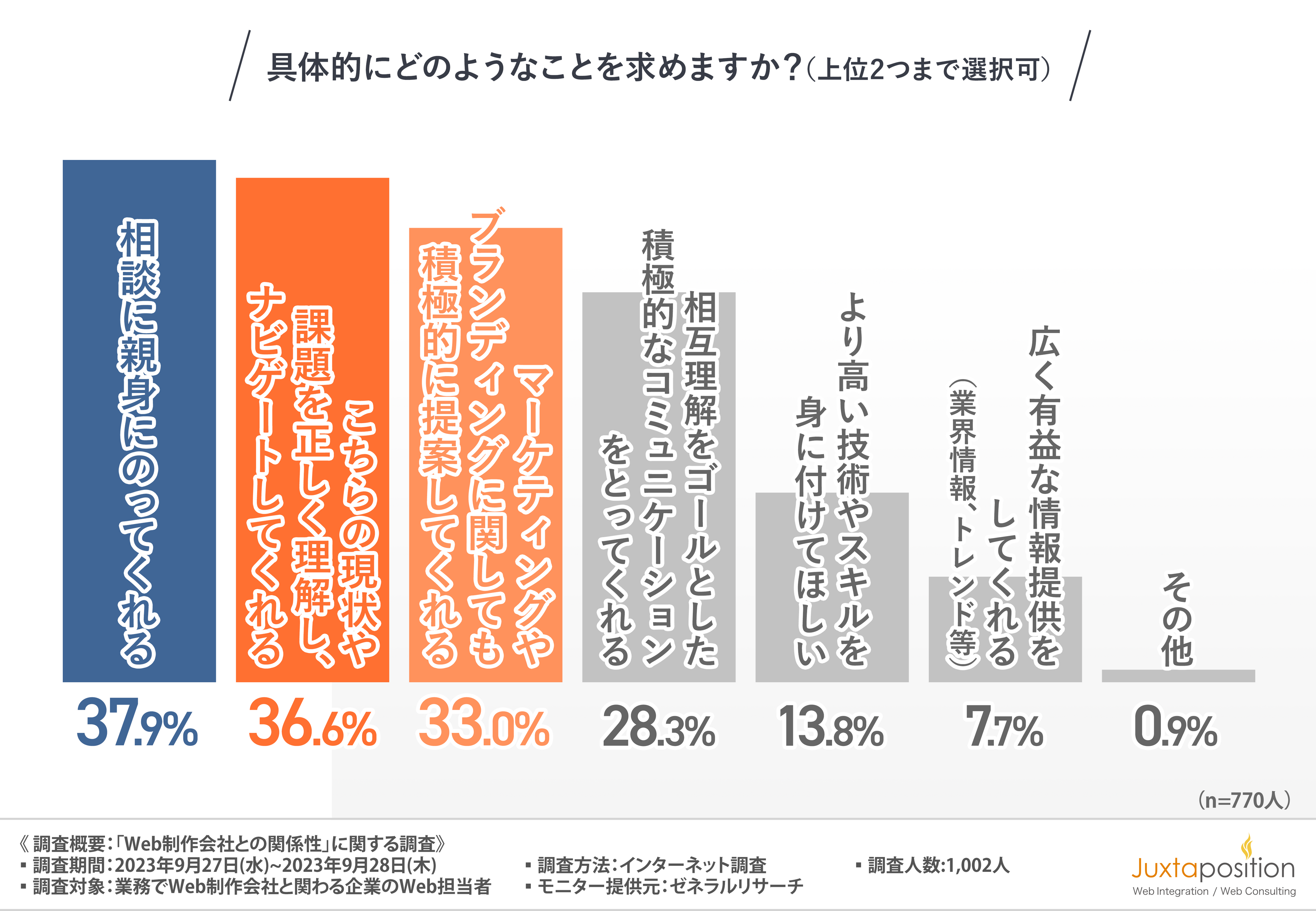 「具体的にどのようなことを求めますか?(上位2つまで選択可)」と質問したところ、『相談に親身にのってくれる(37.9%)』と回答した方が最も多く、次いで『こちらの現状や課題を正しく理解し、ナビゲートしてくれる(36.6%)』『マーケティングやブランディングに関しても積極的に提案してくれる(33.0%)』『相互理解をゴールとした積極的なコミュニケーションをとってくれる(28.3%)』と続きました。