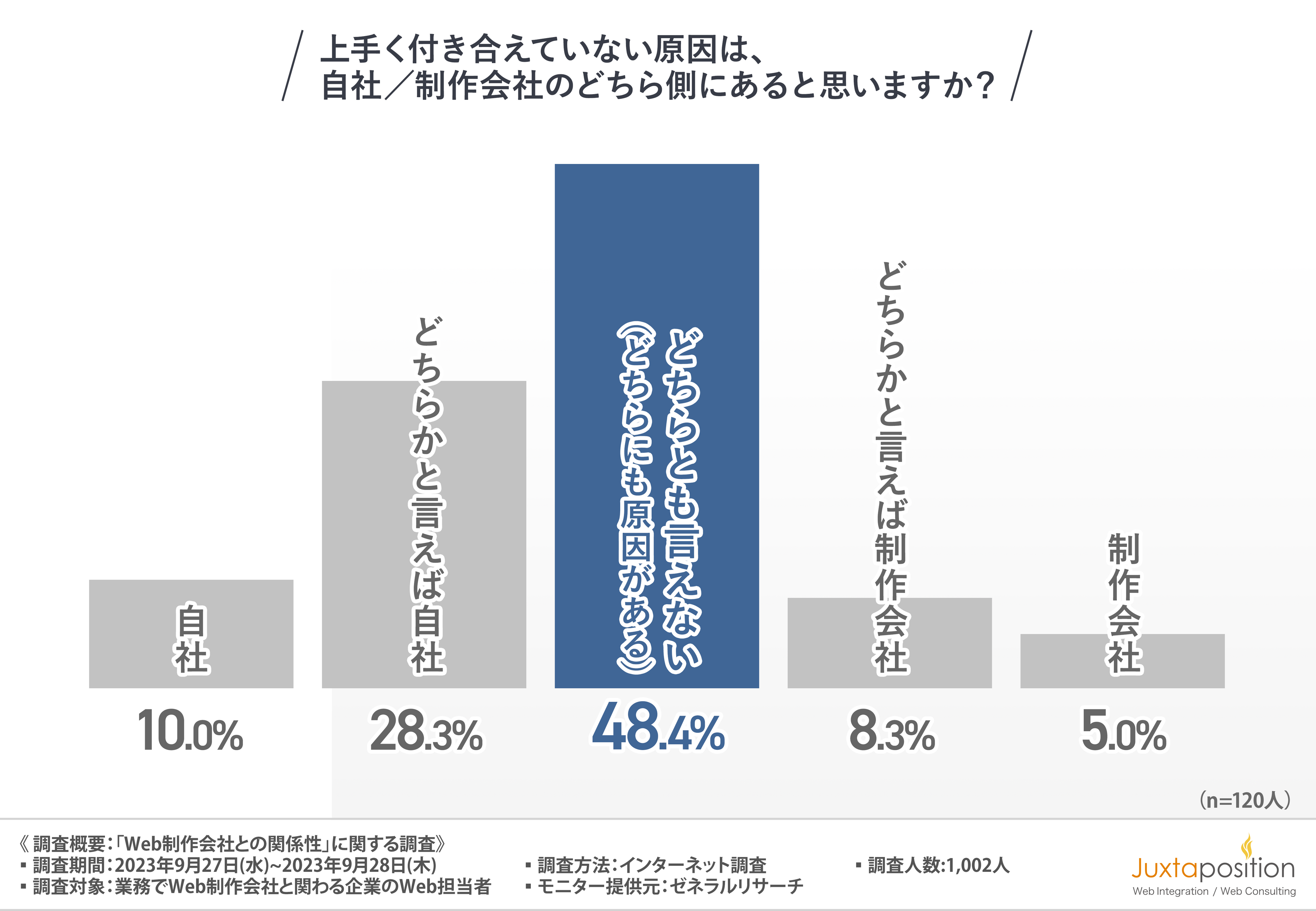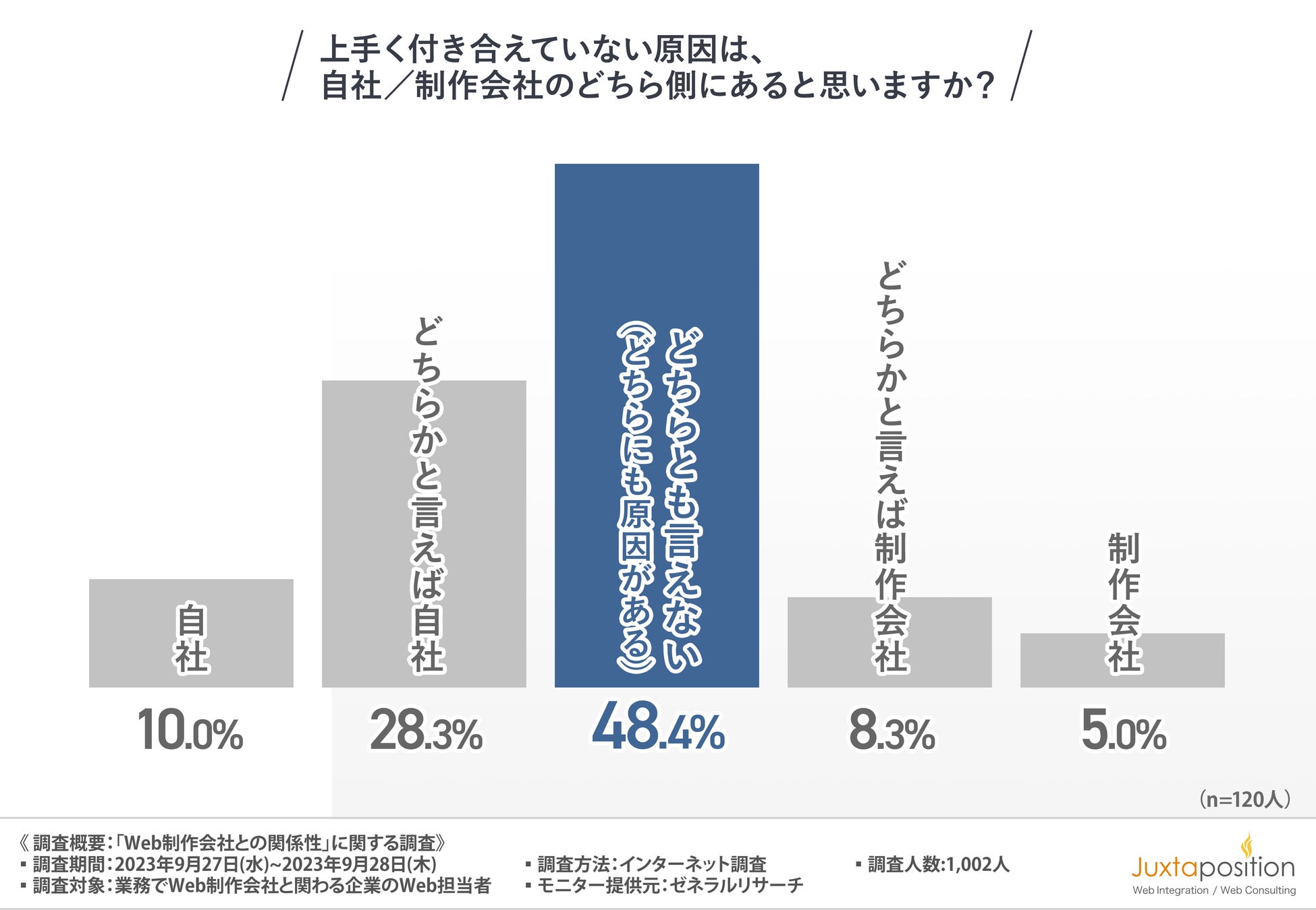 「上手く付き合えていない原因は、自社/制作会社のどちら側にあると思いますか?」と質問したところ、『どちらとも言えない(どちらにも原因がある)(48.4%)』と回答した方が最も多く、次いで『どちらかと言えば自社(28.3%)』『自社(10.0%)』『どちらかと言えば制作会社(8.3%)』『制作会社(5.0%)』と続きました。