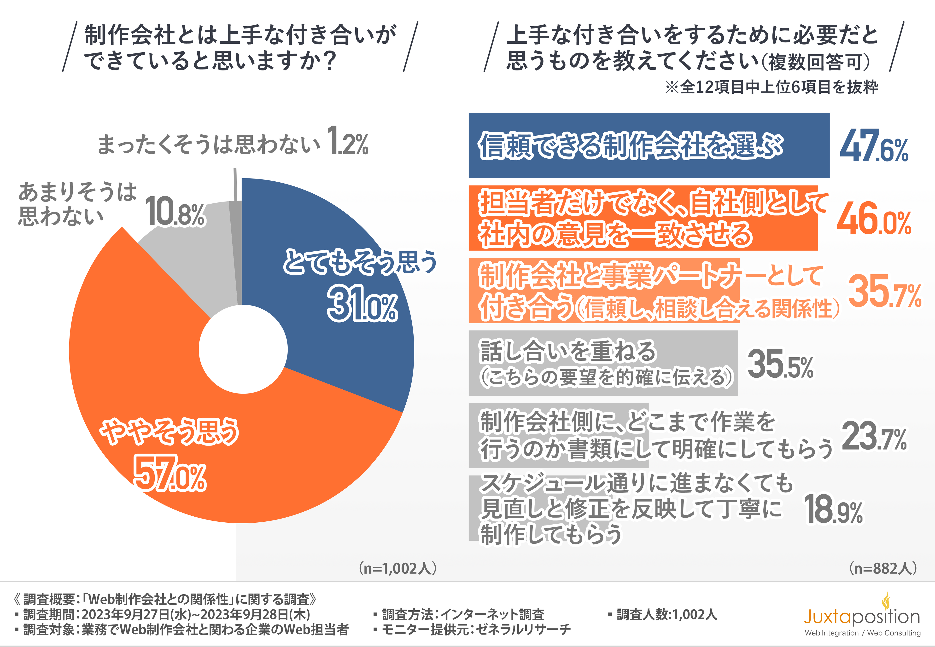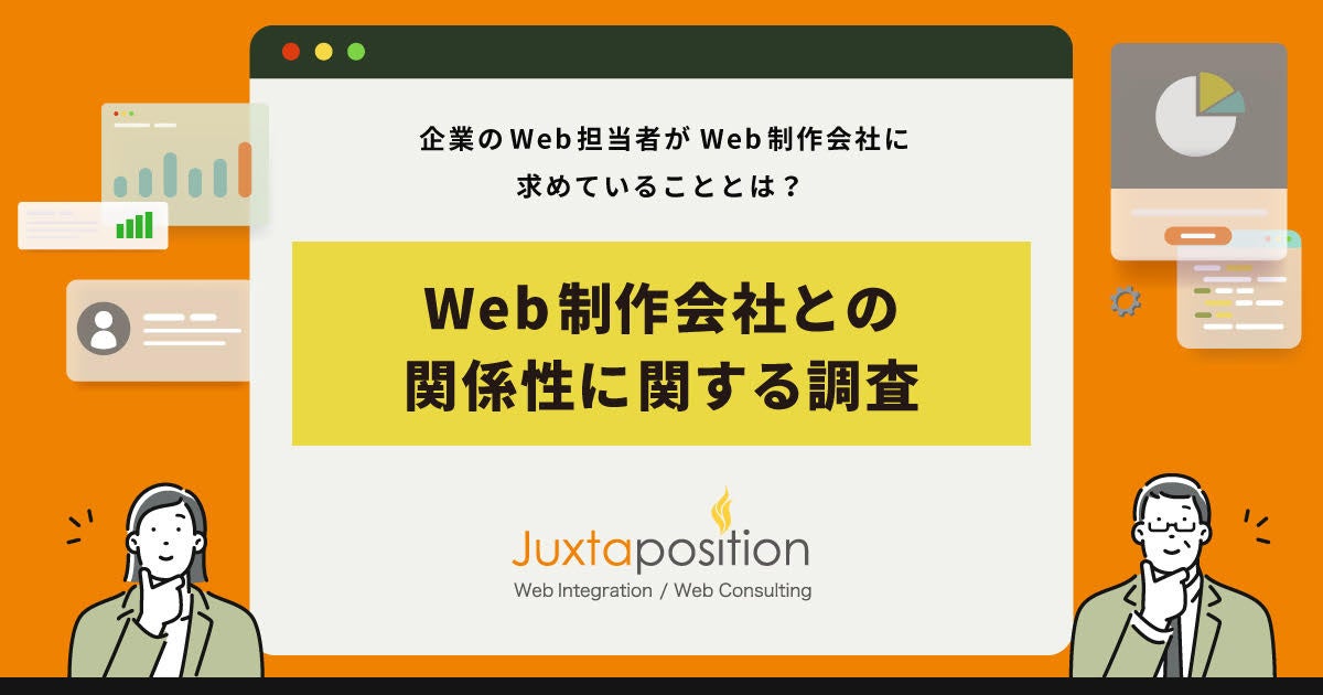 今回、「ウェブでもっと楽しいリアルを創る」を実現するため、ウェブを活用した事業支援を行う株式会社ジャクスタポジション(https://www.juxtaposition.co.jp/service/consulting/)では、業務でWeb制作会社と関わる企業のWeb担当者を対象に、「Web制作会社との関係性」に関する調査を実施しました。