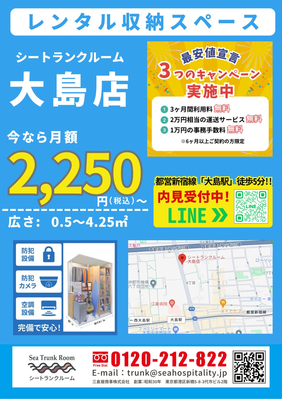 『地域最安値宣言』でお馴染みの【シートランクルーム大島店】が都営新宿線「大島駅」近く、丸八通り沿いに好評オープン中!