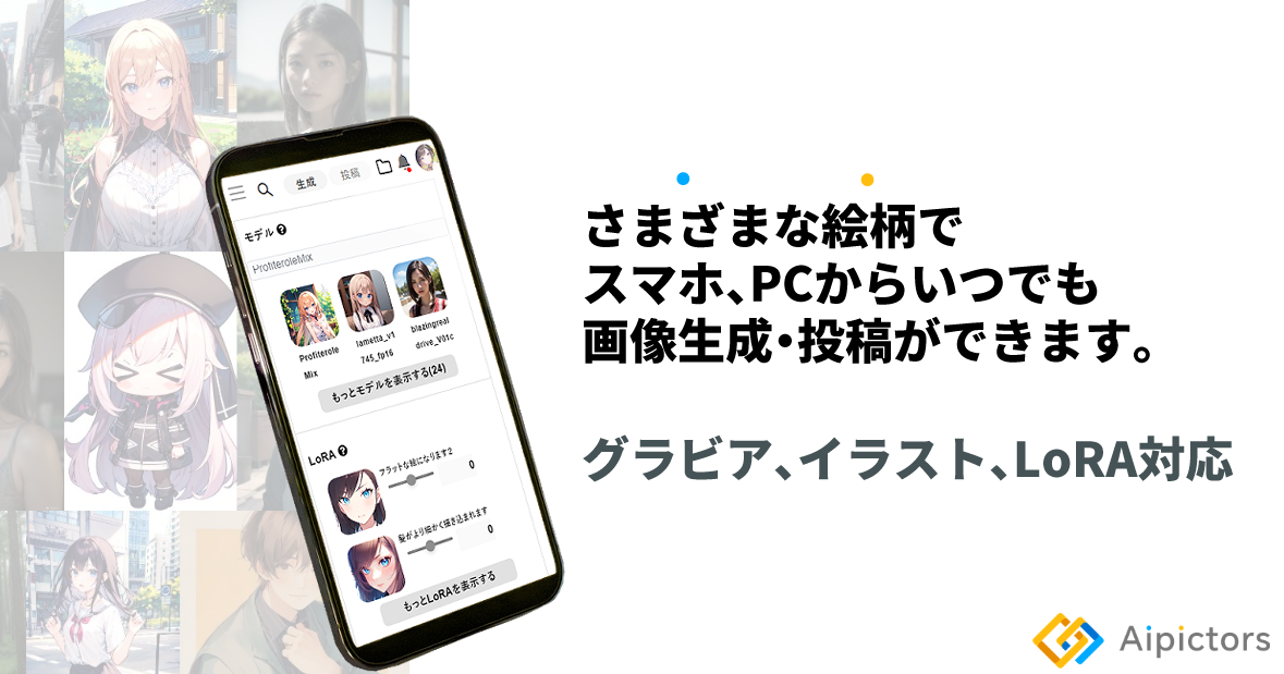 本格的な創作を可能とするため、何十種類ものAI生成に必要なモデルの切り替え、AI画像の絵柄を設定することのできるLoRA*にも対応しています。スマートフォン、PCから生成~投稿まで行うことができます。