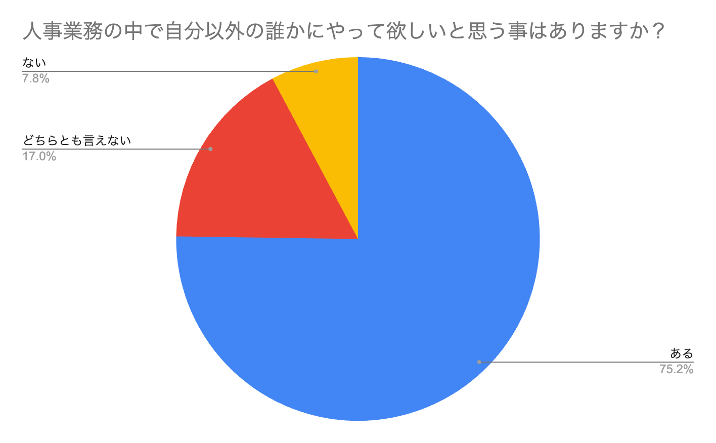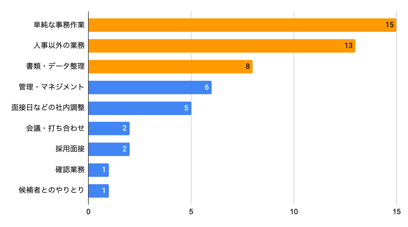 このアンケート調査の結果、大手企業の人事担当者の大半が自分以外の誰かにやって欲しいと感じる業務が存在することが分かりました。中でも、専門外の業務の負担「人事以外の業務」が最も多く挙げられたことから、社内で横断的な協力体制をとっていることが分かりますが、だからこそ業務範囲を明確化する必要があると読み取れます。