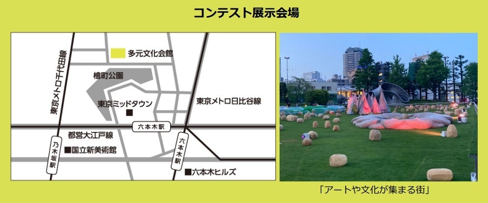 リアル展示会場は、「アートや文化が集まる街」として有名な六本木、赤坂が最寄り駅で、東京ミッドタウンの目と鼻の先にあります。会場周辺は、都内にもか関わらず、近くには自然が溢れ、国内外の住民、観光客、アート好き、ビジネスマンなどが集います。
