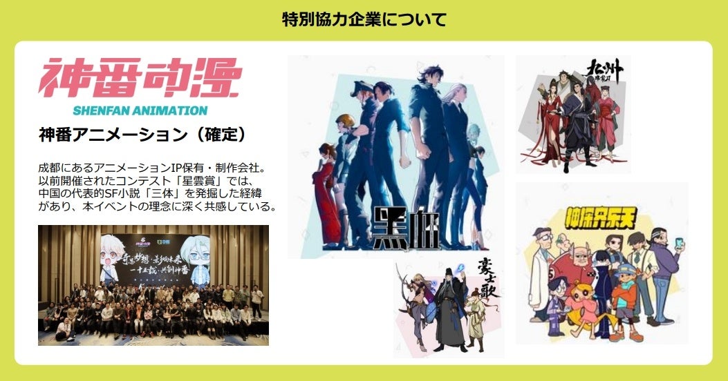 さらに、ASIA IP CONTESTの特別協力企業として、中国の神番アニメーションが参加します。神番アニメーションの代表は過去に中国の有名SF小説『三体』の発掘したコンテストに貢献しました。