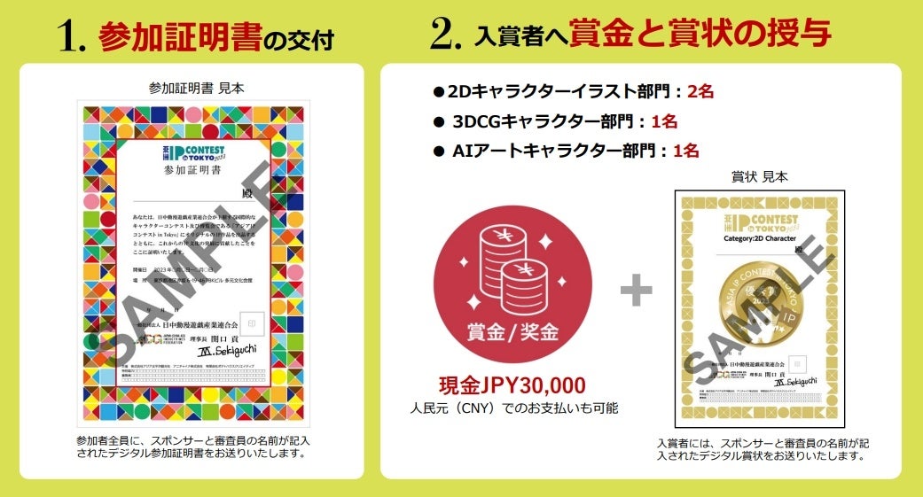 国際的なイベントに参加したデジタル参加証明書を参加者全員に配布します。また、参加証明書や入賞者への賞状は日本語、中国語(簡体字、繁体字)の3種類から選ぶことができ、クリエイターは今後の実績の1つとして扱うことができます。