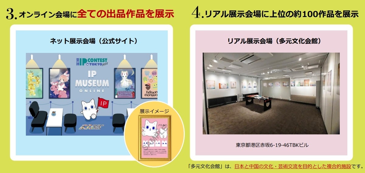 本コンテストではオンライン、リアルの2つの会場で同時開催します。オンライン会場では全ての作品がもれなく展示され、リアル展示会場ではプロに選ばれた最大100名の作品が展示されます。