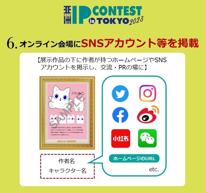 オンライン会場には全ての応募作品が展示されます。今回は多くの企業、クリエイターに見られる場だからこそ、作品に参加クリエイターのSNSやホームページをもれなく掲載し、ビジネスチャンスへ繋げることもできます。