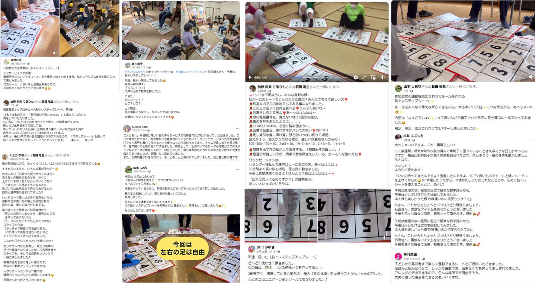 「これ、楽しい!」「これどこで売ってるの?」「家にいる時も、これをやってれば頭も足も使えるから欲しい!」「売り出したら教えて欲しい!」等々、嬉しいお言葉をいっぱい頂きました!これからも「脳トレステップシート」を使って、楽しく、いつまでも元気でいられる活動を続けていきたいと思います。