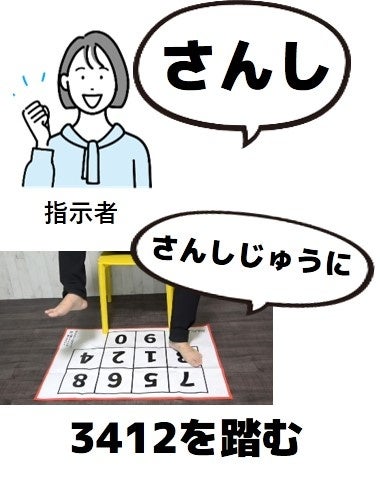2桁~6桁の数字を覚えて数字を言いながら踏む。2桁から3桁、4桁と増やして難易度アップ!
