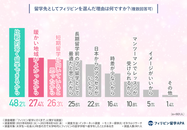 留学先としてフィリピンを選んだ理由は【費用の安さ】が最多