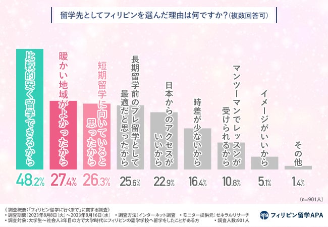 フィリピン留学経験者のおよそ半数が“費用の安さ”を理由に留学先を選んだと回答!約7割が大学2年生までに留学している理由とは?