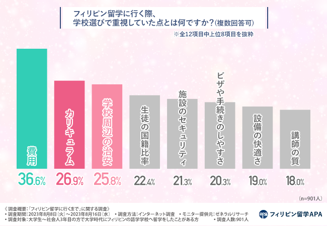「フィリピン留学に行く際、学校選びで重視していた点とは何ですか?(複数回答可)」と質問したところ、『費用(36.6%)』と回答した方が最も多く、次いで『カリキュラム(26.9%)』『学校周辺の治安(25.8%)』『生徒の国籍比率(22.4%)』『施設のセキュリティ(21.3%)』と続きました。