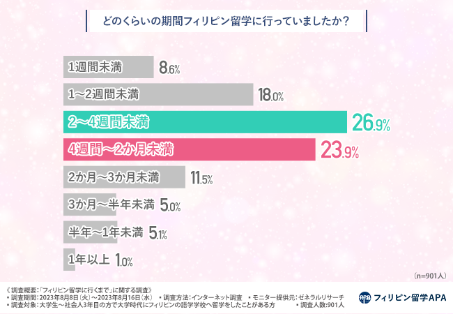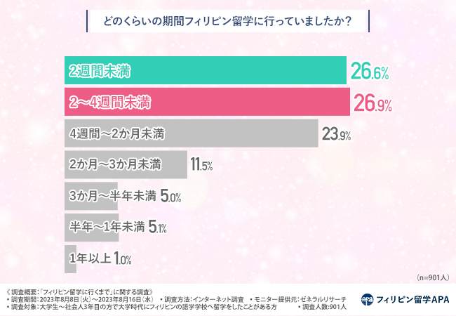 「どのくらいの期間フィリピン留学に行っていましたか?」と質問したところ、『2~4週間未満(26.9%)』と回答した方が最も多く、次いで『2週間未満(26.6%)』『4週間~2か月未満(23.9%)』『2か月~3か月未満(11.5%)』と続きました。