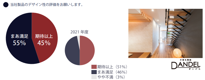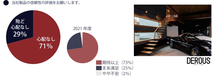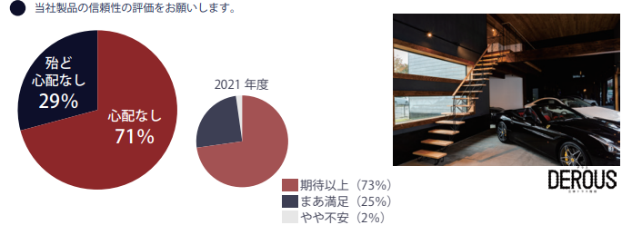 弊社への信頼性およびデザイン性の評価が、過去最高満足度である100%を達成しました。(期待以上+まあ満足/心配なし+ほとんど心配なしの値)弊社の細部までこだわりぬくものづくりの姿勢がこの結果につながったと考えています。