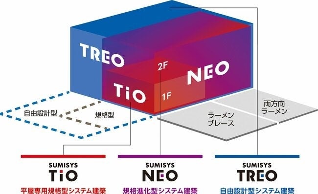 工場、倉庫、事務所、店舗の建築において「低コスト」「短工期」「高い耐震性」「環境への配慮」「安心のメンテナンス」などの建築主の様々なニーズに対応できるシステム建築を自社開発。従来の平屋専用規格型の「TiO(ティオ)」、自由設計型の「TREO(トレオ)」に2019年より規格進化型の「NEO(ネオ)」を加えた3シリーズでの商品群は業界随一のバリエーションを誇ります。その対応力の広さから、現在、3シリーズにおける実績は年間200棟・累計4,500棟を超えています。