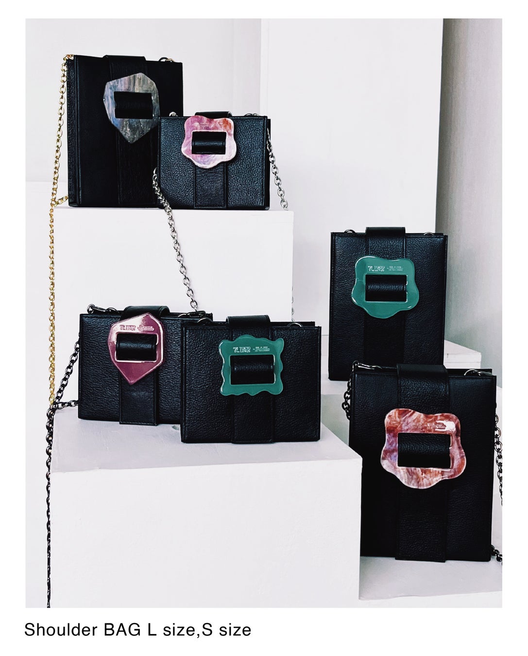 同時に、大きなアクリルもバックルと本革を組み合わせた「Acrylic buckle shoulder bag」にも、新たに3種類のカタチのバックルが仲間入り。