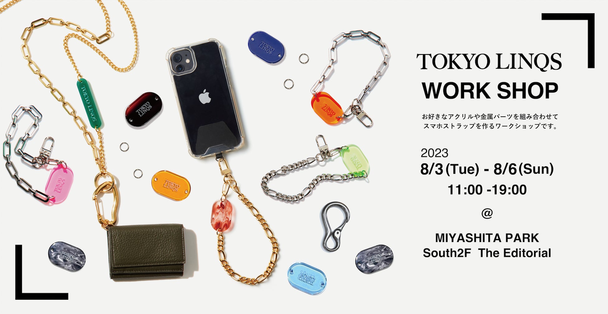8/3(木)~8/6(日)の4日間、11:00-19:00の時間帯では、お好きなアクリルや金属パーツを組み合わせてスマホストラップを作るワークショップを開催いたします。