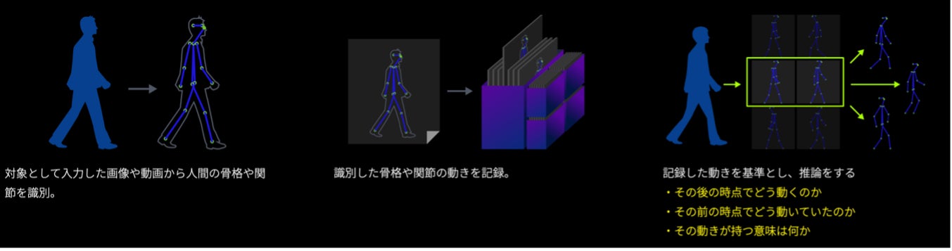 人の歩き方から情報を識別、映像などから特徴や違いを抽出し個人を特定します。