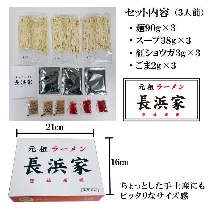 店主の中里氏と何度も協議を重ねて出来上がったこだわりのセット内容は、長浜家の看板と同じシンプルパッケージ、粉っぽさが残る細い生麺、臭みがなくあっさりコクのある毎日食べても飽きのこないスープに、真っ赤な紅ショウガなど、長浜家を限りなく再現しました。