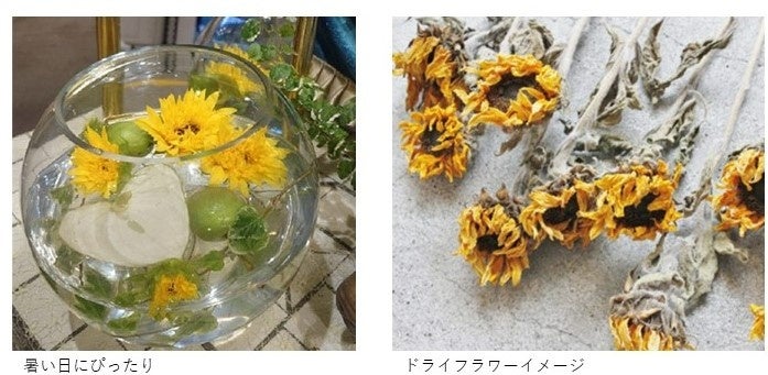 8月も末とはいえまだまだ暑い日が続きます。ガラスの器に水をはり茎を短くした花弁を浮かべるのも、この時季ならではの楽しみ方。また、風通しのいいところに逆さまにして吊るしておくことでドライフラワーにも出来、秋冬まで長く楽しめます。