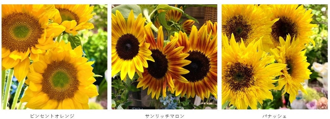 切花ヒマワリの魅力は品種の多さ。今回は明るく華やかな「ビンセントオレンジ」、落ち着いたブラウンタイプの「サンリッチマロン」、個性豊かな八重咲の「パナッシェ」が入荷します。1本からブーケまでお客様のご希望に応じて販売します。