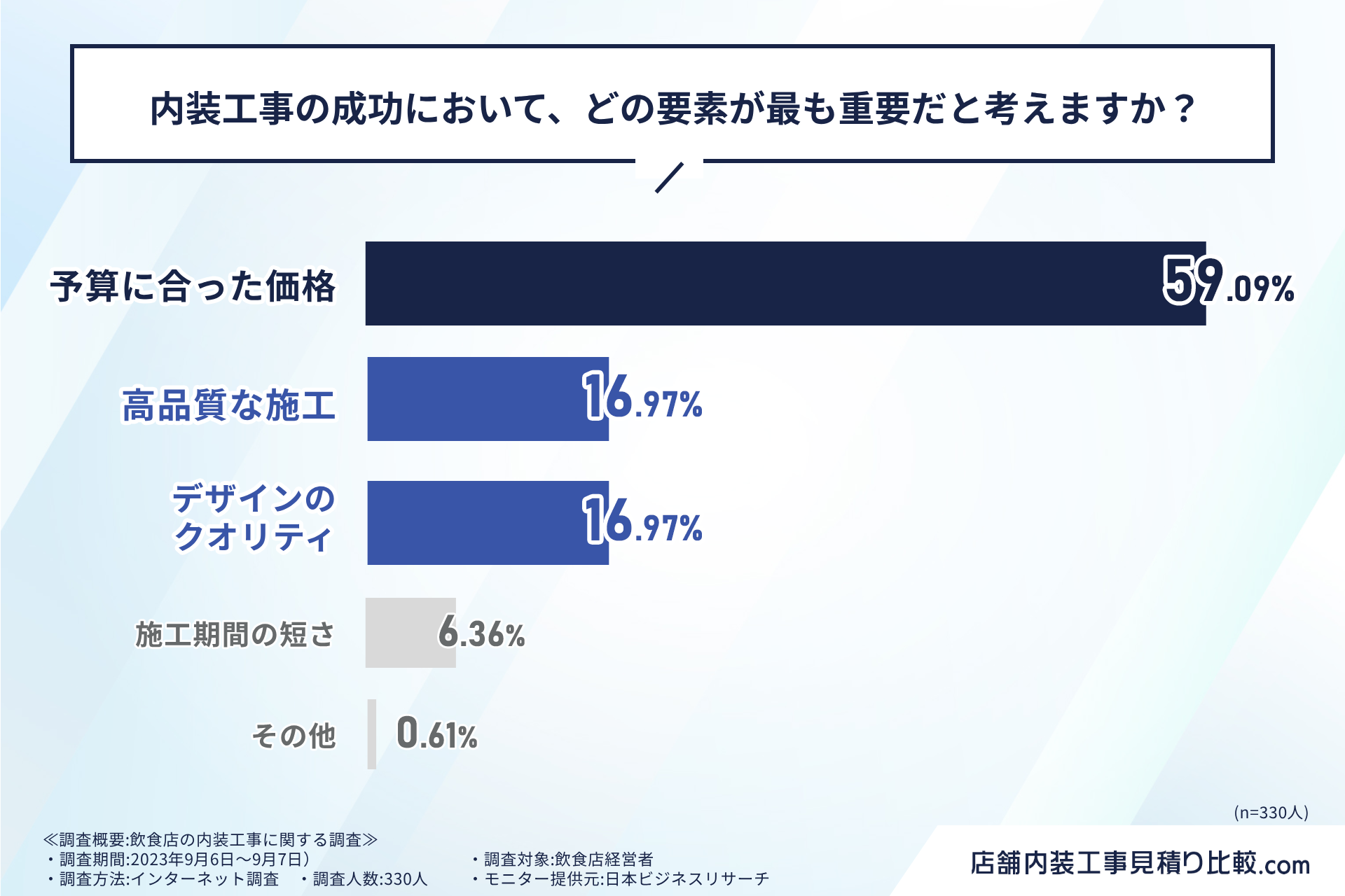 多くの飲食店経営者が重要だと考える要素は「予算に合った価格:59.09%」と非常に高い数値です。そもそも予算にあった価格で提案を行ってほしいという工事会社への思いが回答に出ているのだと判断できます。
