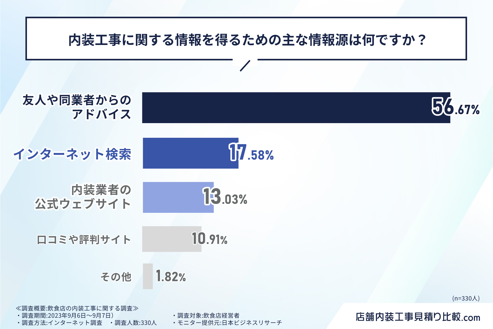 「友人や同業者からのアドバイス: 56.67%」、「インターネット検索: 17.58%」、「内装業者の公式ウェブサイト: 13.03%」という順の結果になりました。