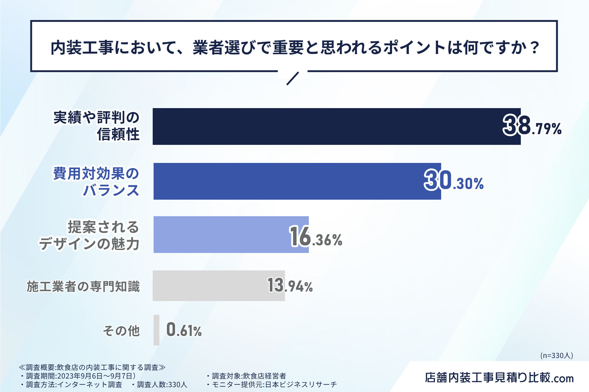 飲食店経営者が業者選びにおいて重要だと考える要素は「実績や評判の信頼性: 38.79%」でした。これは、信頼性の高い業者を選ぶことで予算通りの提案が受けられて、かつ求めている内装工事を実施してもらえると考えているように感じます。