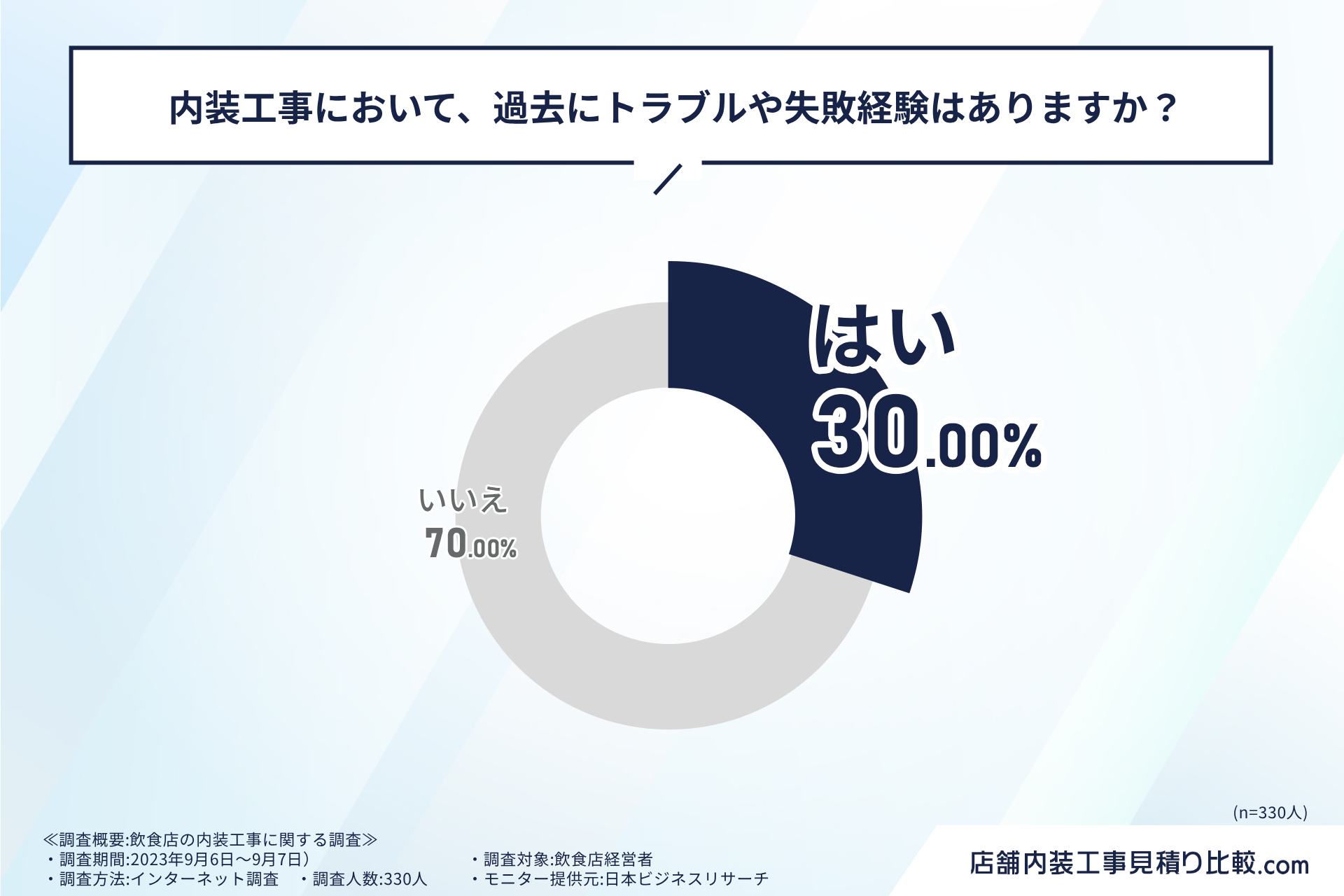 驚くべきことに、飲食店経営者の30%が内装工事において過去にトラブルや失敗経験があると回答しています。