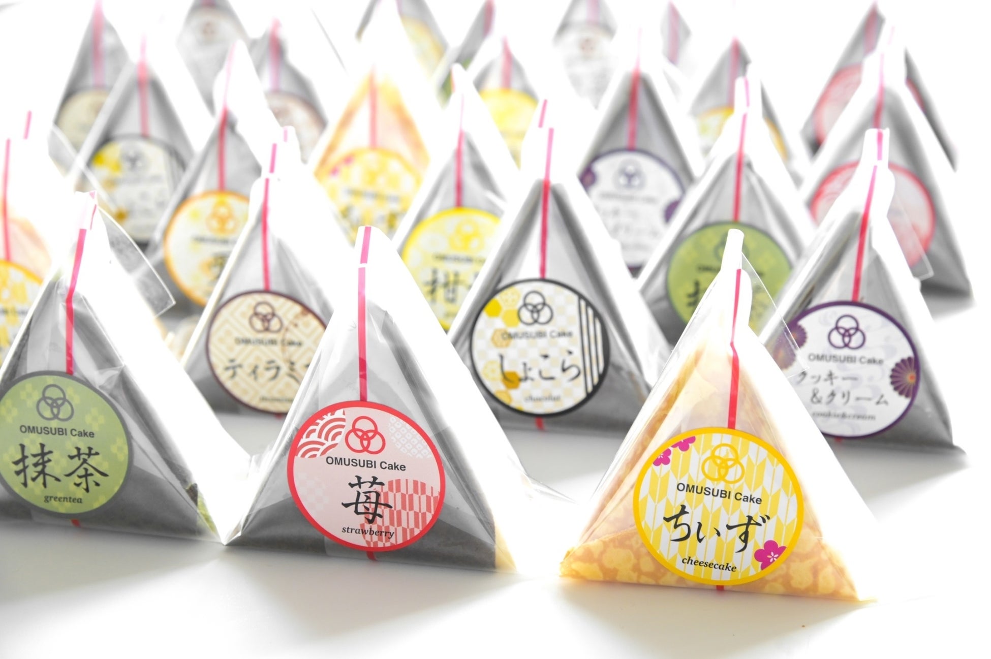 [大阪発祥] 見た目はおむすびなのに中身はケーキ! 日本人には馴染みの深い三角形の形状のワンハンドスイーツ。 見た目はおむすび、なのに中身はケーキ。そんな斬新なスイーツはそれがきっかけで会話が始まったり、会話が増えたり、とにかく人の笑顔の手助けになればと開発されました。
