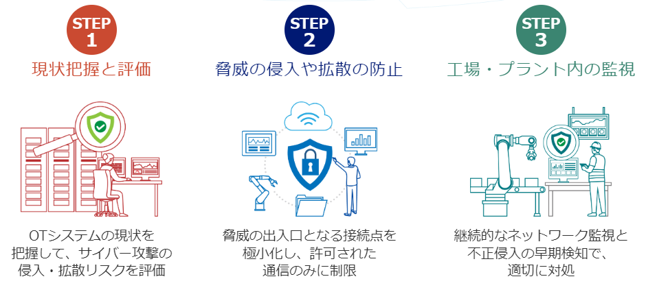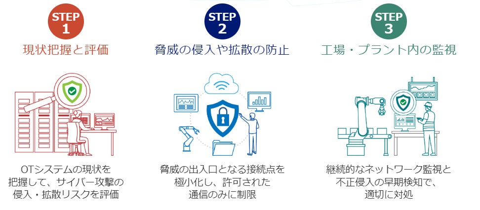 上記3つのステップの詳細は、https://jp.security.ntt/products_and_services/ot_securityをご確認ください。