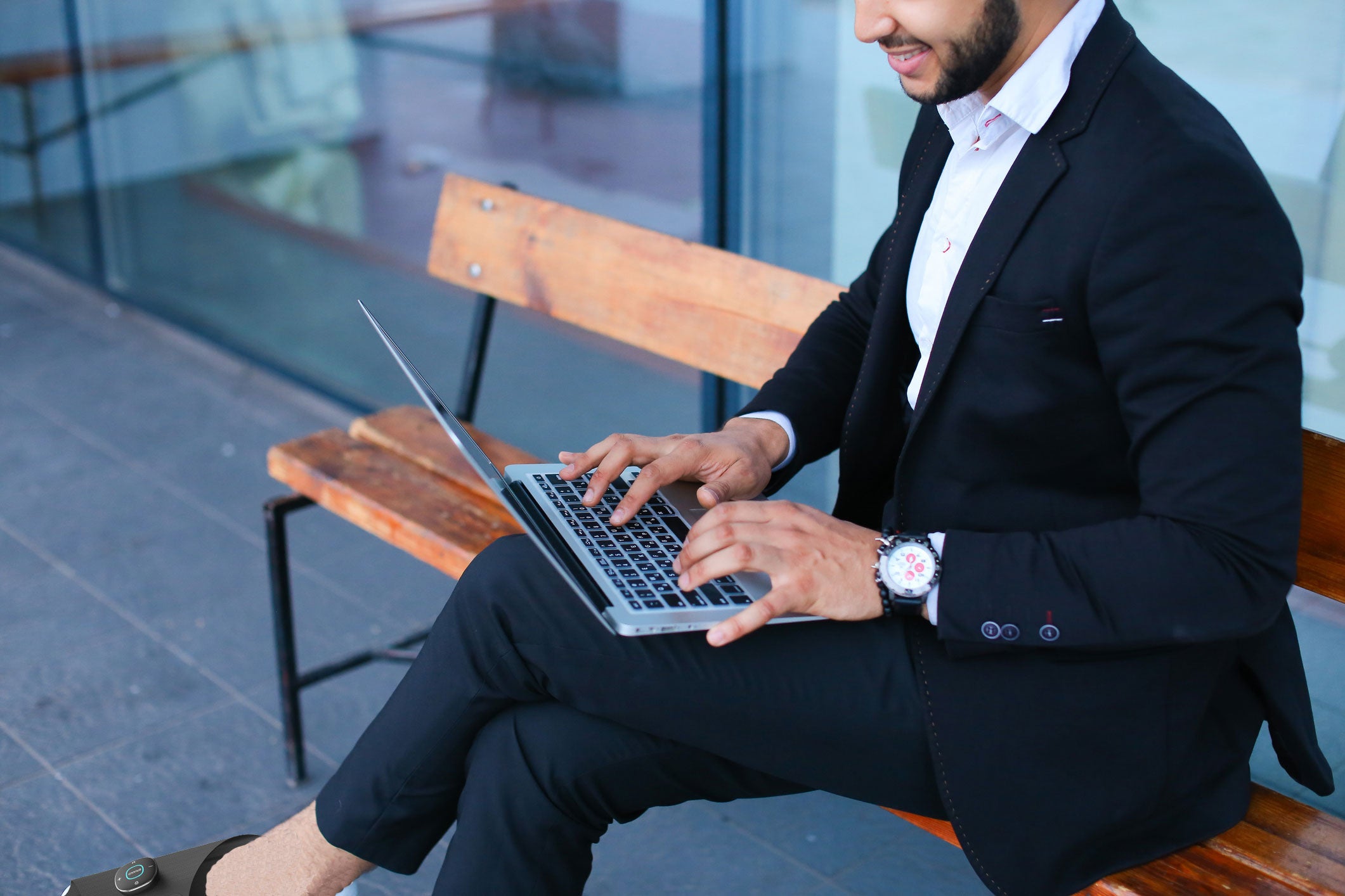 デスクワーク中に足を組みながら、