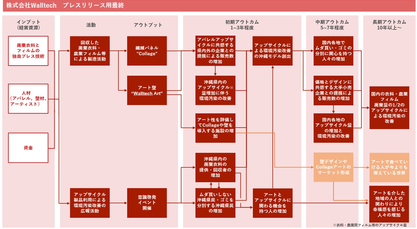 WALLTECHは、本出資と沖縄公庫による融資の協調支援(計2,800万円)で調達した資金をもとに、沖縄県内で廃棄されている衣料品および農業用フィルムを活用した繊維パネルの製造・販売事業を推進し、県外でも展開可能性のあるアップサイクルモデルを沖縄から創造することを目指します。