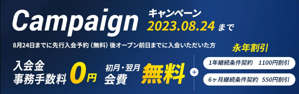 現在、月会費永久割引などの特典で入会できるお得なキャンペーン実施中。特典適用での入会をご希望の方はまずは無料先行入会予約(8/24まで)をお済ませの上、詳細案内をお待ちください。