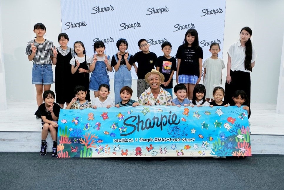 後半では、つるの剛士さんと参加者全員でひとつの作品を仕上げていくワークショップも実施。参加者たちが、海の生物の切り絵に色を塗り、それを縦70㎝、横270cmの大きな海の絵に貼りつけていき、海の中を泳ぐ生き物の群れを完成させ、つるの剛士さんがサインを入れて、全員で記念撮影。子どもたちといっしょに楽しんだつるの剛士さんは「Sharpieのようなカラフルな人生を!」と伝え、“Sharpieで描いた夏の思い出”を閉会しました。