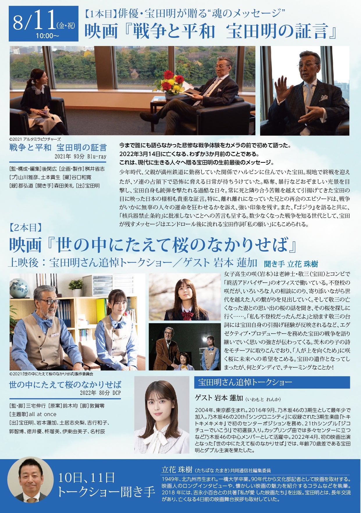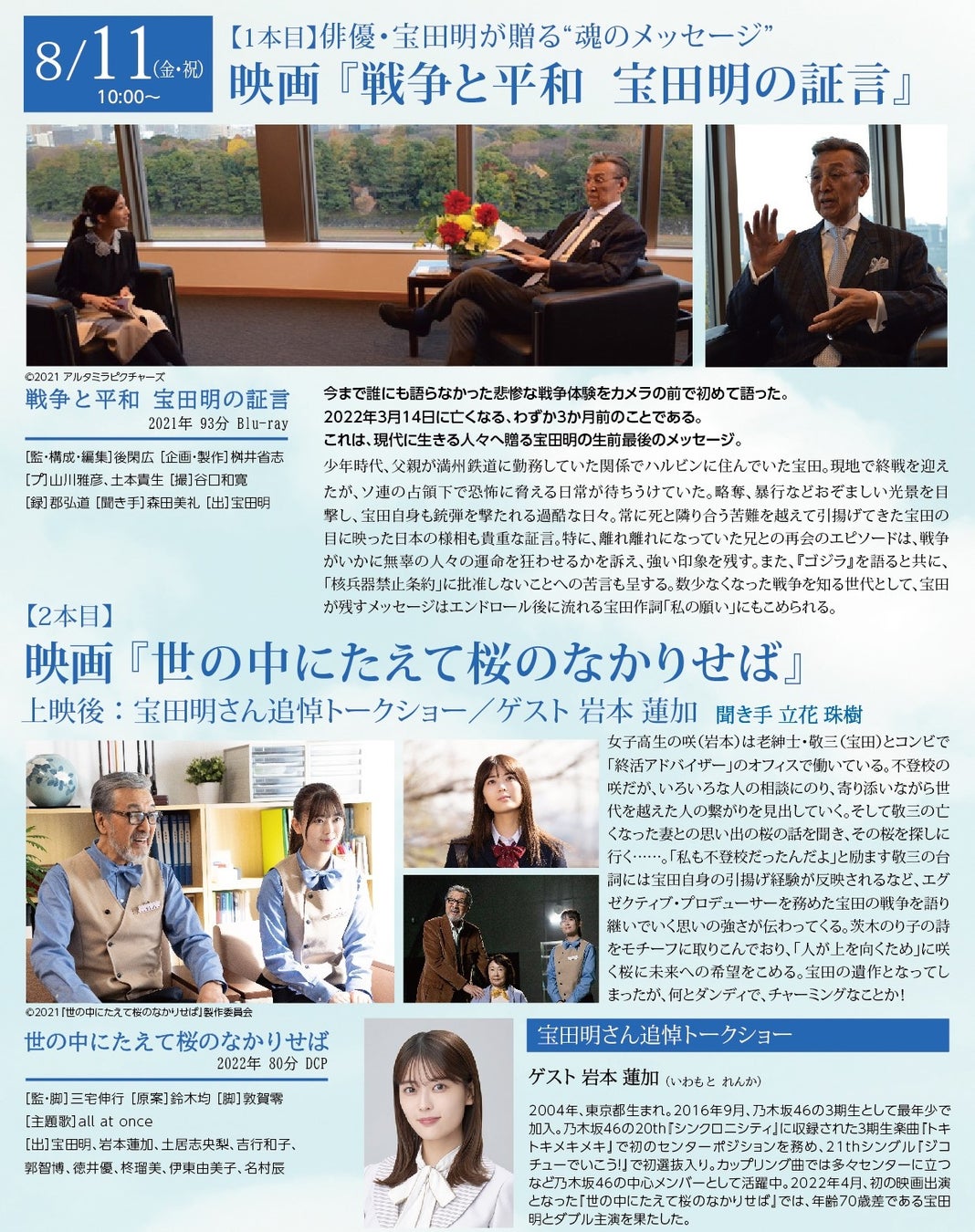映画『戦争と平和 宝田明の証言』上映/映画『世の中にたえて桜のなかりせば』上映