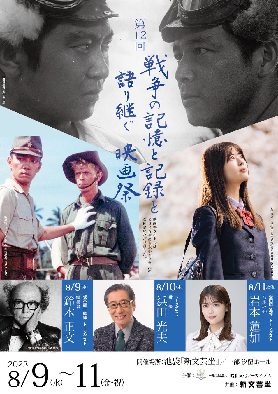 それぞれの上映にはトークショーが付いていて、『戦場のメリークリスマス』では坂本龍一氏の盟友で編集者の鈴木正文さん、『零戦黒雲一家』では出演俳優の浜田光夫さん、『戦争と平和 宝田明の証言』『世の中にたえて桜のなかりせば』のセット上映では、遺作となった『世の中にたえて桜のなかりせば』で宝田氏とダブル主演を果たした乃木坂46の岩本蓮加さんの登壇が決定しました。チケットは、上映の1週間前から新文芸坐オンライン・窓口にてチケット販売されます。