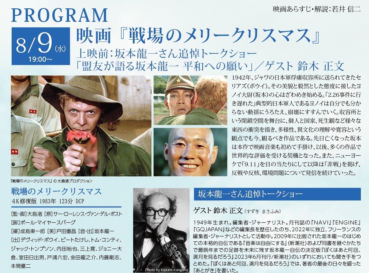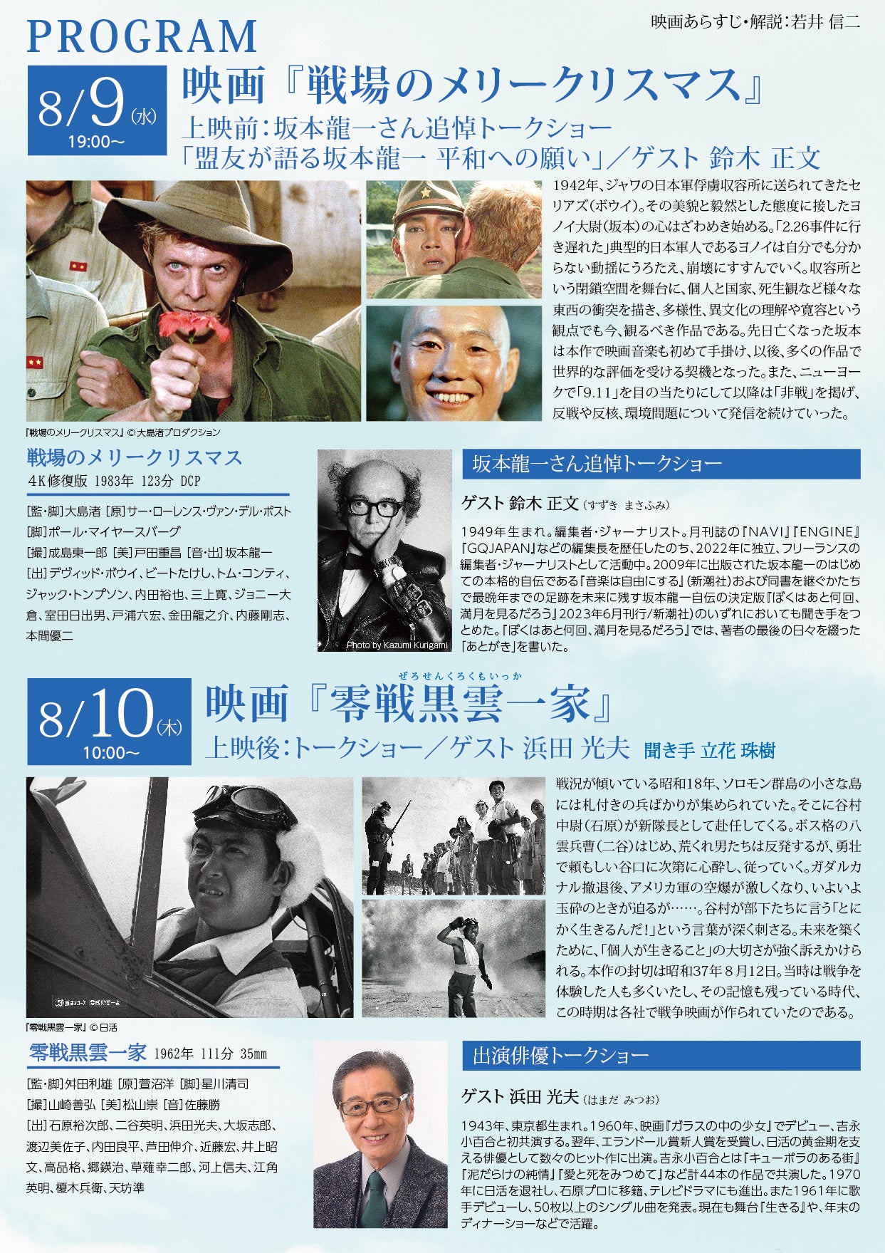 非戦という言葉を用いて平和の尊さを伝えてきた故・坂本龍一氏(今年3月に逝去)を偲び、坂本氏が出演し、音楽も手掛けた映画『戦場のメリークリスマス』(1983年)の上映や、石原裕次郎氏、二谷英明氏、浜田光夫氏など往年の日活俳優出演の戦争映画『零戦黒雲一家』(1962年)の上映、さらに昨年3月に急逝した俳優の宝田明氏を追悼し、宝田氏が経験した旧満州からの過酷な引き揚げの記憶を収められた証言映画『戦争と平和 宝田明の証言』(2021年)と、宝田氏自らが企画しエグゼクティブプロデューサー・主演を務めた『世の中にたえて桜のなかりせば』(2022年 ※公開前に急逝し遺作となってしまった)の2作セット上映、計4作品を上映いたします。