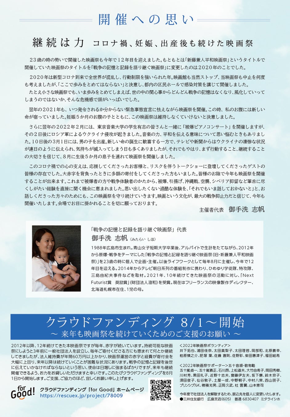 前身は2012 年から毎年 8 月に御手洗志帆が個人で開催してきた「新藤兼人平和映画祭」。広島出身の映画監督の新藤兼人の作品を始め、原爆・戦争をテーマにする映画を上映し、映画ゆかりの人物をゲストに招き開催してきた映画祭です。
